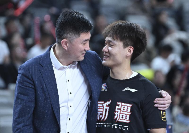 3月10日新疆伊力特队球员赵睿(右)与广东东阳光队主教练杜锋在比赛前交流。这对师徒将在十五运会上再携手。新华社发